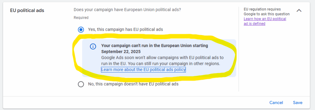 I just came across this new ‘EU political ads’ campaign setting in Google Ads: